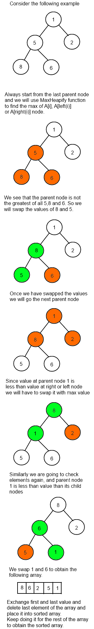 In the above algorithm, we will first build the max-heap from the given array. Next we parse the array from the array size till 2 which is the second element of the array. Once we get only one element remaining in the array heap, we don’t need to parse it further. But till the time we have more than 1 element in the array, we will take the last element of the array and exchange it with the first element since in a max-heap the largest element is at the root node and build the max heap of the array. This process will continue till we get all the element in the array sorted.
