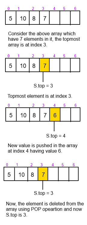 In the above example the new array element is inserted into last position using PUSH operations and deleted from the last position using POP operation.