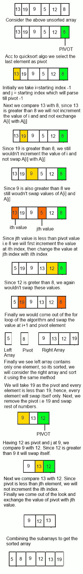 In the partition algorithm above we pass array A, starting index p and ending index ‘r’ to the array. Usually we take the last element as the pivot element, however we can take any element as the pivot element. For the simplicity we will take the last element of the array as pivot element. Next we take an index ‘i’ which has an initial value less than the zero index of the array, further we will parse the complete array till the pivot element and once we find the value of pivot element greater than the current element we will increment the value of ‘i’ and exchange current element with the A[i] element. Once the entire array has been parsed we will finally change the pivot value with the current ith value to get the desired index of the pivot.